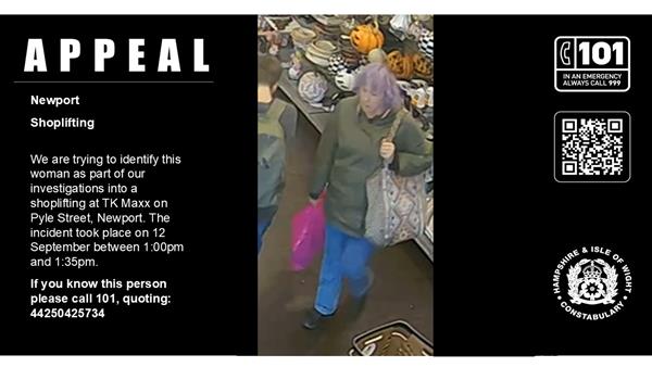 We are appealing for witnesses after it was reported that a woman walked out of TK Maxx on Pyle Street, Newport, with two pairs of shoes that she had not paid for. The incident took place on 12 September between 1:00pm and 1:35pm. Following enquiries we are now able to share an image of a woman who we believe may be able to assist with our investigation. She is described as, If you recognise this woman, or were in the area at the time and saw anything suspicious, please call 101 and quote 44250425734. Additionally, we’d like to hear from you if you have CCTV, dashcam, mobile phone, or doorbell camera footage that may assist our enquiries. You can also share any information with us online via the Hampshire & Isle of Wight Constabulary website, below: https://www.hampshire.police.uk/tua/tell-us-about/cor/tell-us-about-existing-case-report/ Alternatively, you can call Crimestoppers, anonymously, on 0800 555 111, or report via their website, below: | ||
