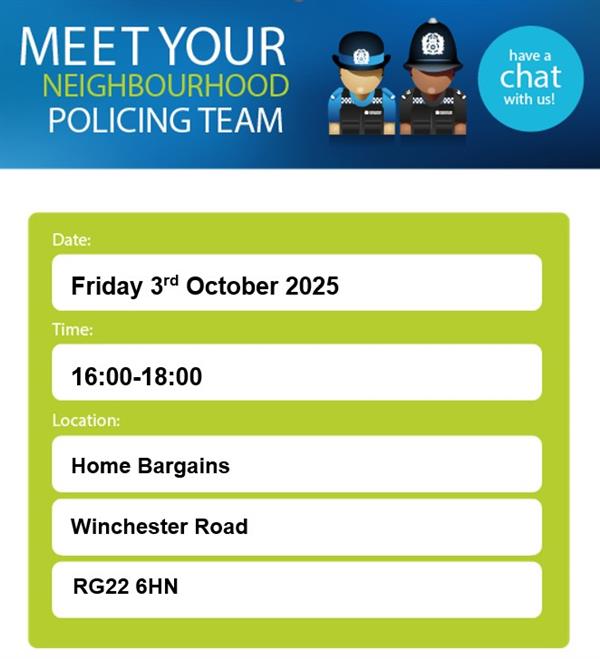 On Friday 3rd October 2025 between 16:00- 18:00, PCSO Emma Page and PC Alex Laing from the South/West Neighbourhood Policing Team will be holding a Beat Surgery in the foyer of Home Bargains, Winchester Road, Basingstoke.
