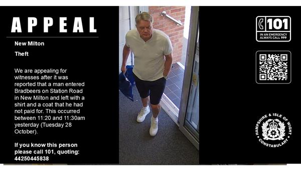 We are appealing for witnesses after it was reported that a man entered Bradbeers on Station Road in New Milton and left with a shirt and a coat that he had not paid for. This occurred between 11:20 and 11:30am yesterday (Tuesday 28 October). Following enquiries we are now able to share an image of a man who we believe may be able to assist with our investigation. He is described as: If you recognise this man or were in the area at the time and saw anything suspicious, please call 101 and quote 44250445838. You can also share any information with us online via the Hampshire & Isle of Wight Constabulary website, below: https://www.hampshire.police.uk/tua/tell-us-about/cor/tell-us-about-existing-case-report/ Alternatively, you can call Crimestoppers, anonymously, on 0800 555 111, or report via their website, below: | ||